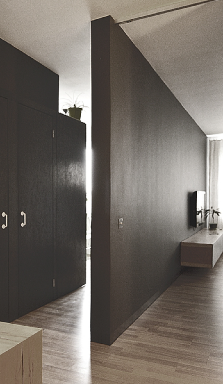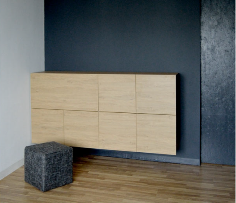 Предмет под ТV- консольный (висит на стене) ,его фасад тканевый на липучке для легкого проникновения звука изнутри.