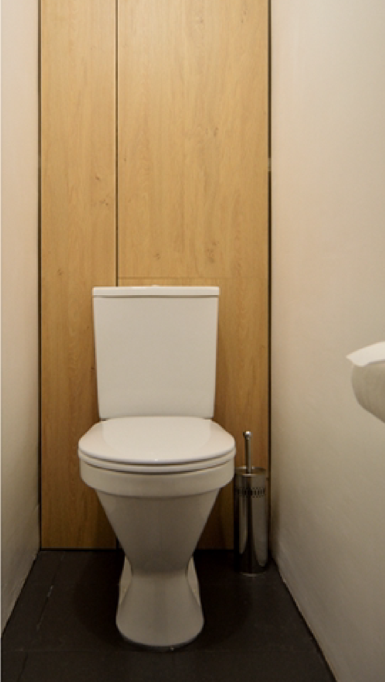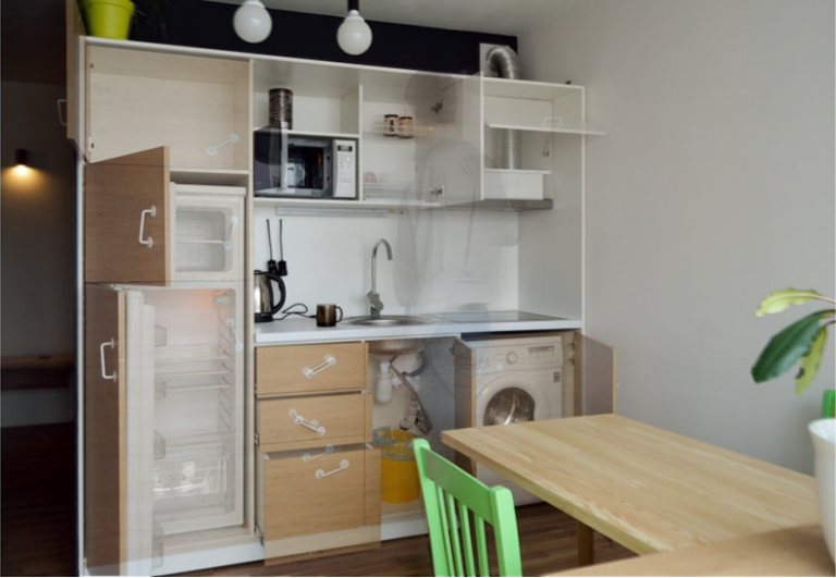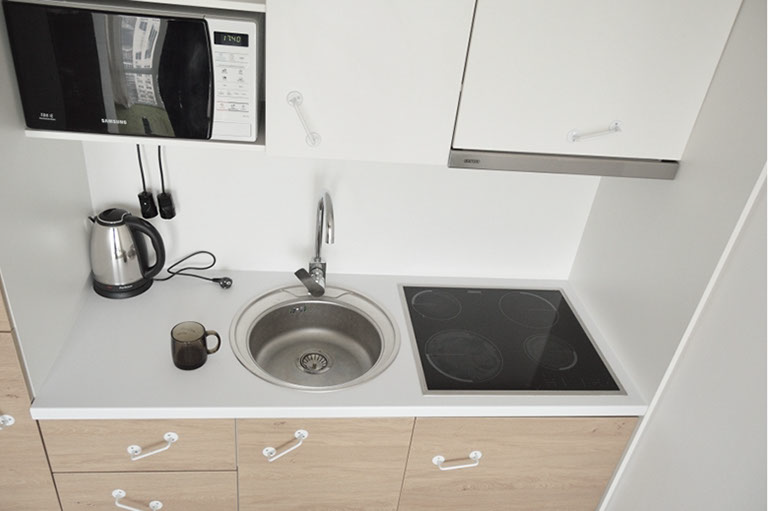 Внутри аудиосистема, которая несет звук и в кухню, и в ванную комнату.