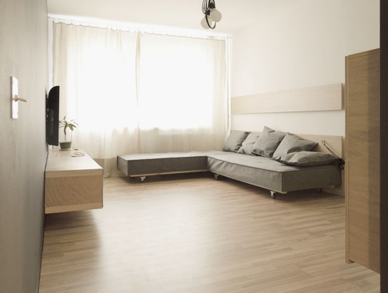 Гостиная зона vs спальня, в зависимости от потребностей. Диван, который предназначен для большой компании, легко трансформируется в кровать.